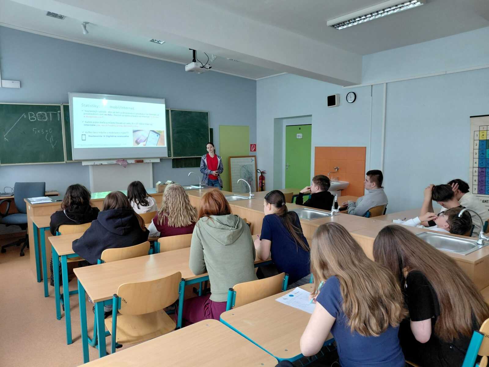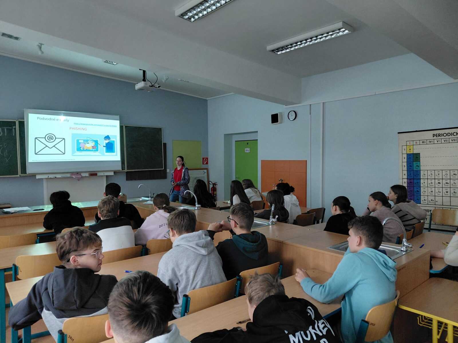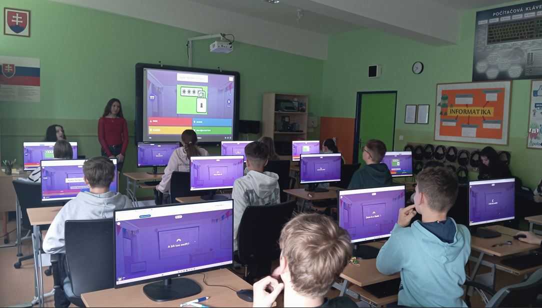 Daniela (2.Ag), Natália (1.Ag) a Simona (1.Ag), členky nášho KyberTímu, pripravili 20. apríla 2026 pre tri ôsmacké triedy dokopy 6 workshopov. Žiaci sa dozvedeli zaujímavé informácie o digitálnych stopách, o rôznych podvodoch – ako ich rozpoznať a ako sa chrániť v digitálnom priestore, vyskúšali si tester hesiel, overovali úniky údajov aj podvodné odkazy a na záver absolvovali bezpečnostný kvíz. Dokopy sme dnes vyškolili 50 žiakov ôsmeho ročníka.