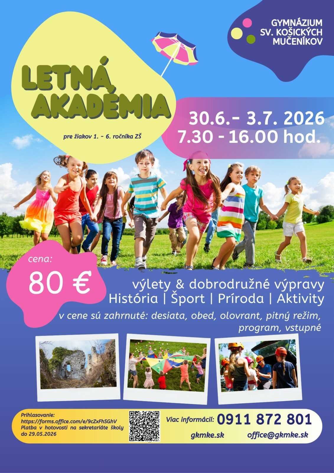 v termíne od 30.6. do 3.7.2026 organizujeme Letnú akadémiu formou výletov a aktivít v škole v časoch od 7.30 do 16.00 h pre žiakov 1. – 6. ročníka základnej školy. Poplatok vrátane stravy za akadémiu je 80 eur. Je potrebné uhradiť ho hotovostne na sekretariáte školy do 29.05.2026.