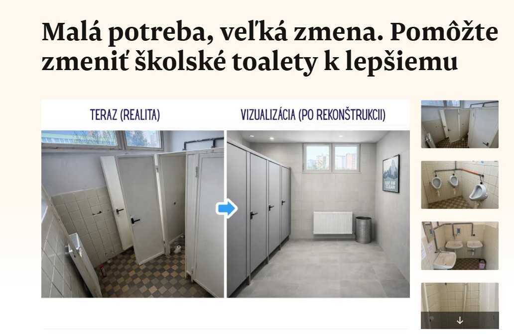 obraciame sa na vás s veľkou prosbou. Naša škola nutne potrebuje rekonštrukciu toaliet, ktorých stav je už dlhodobo nevyhovujúci a nekomfortný pre každodenné fungovanie nás všetkých.