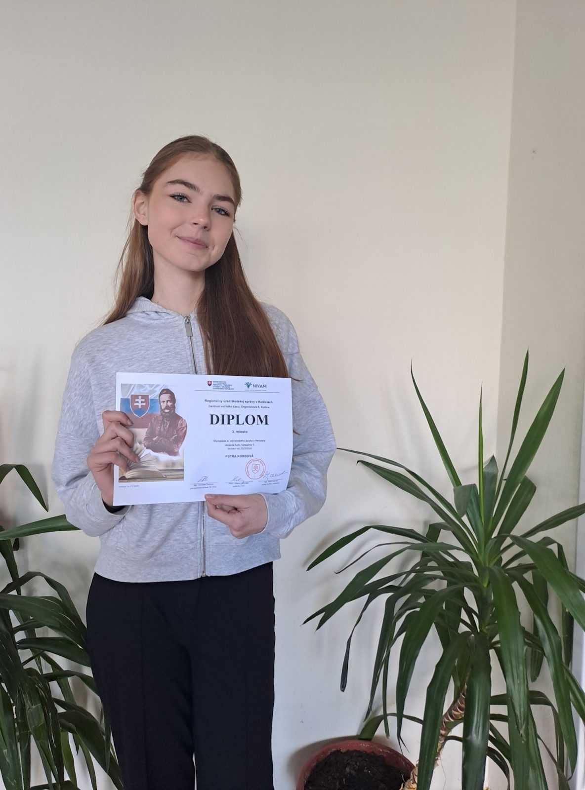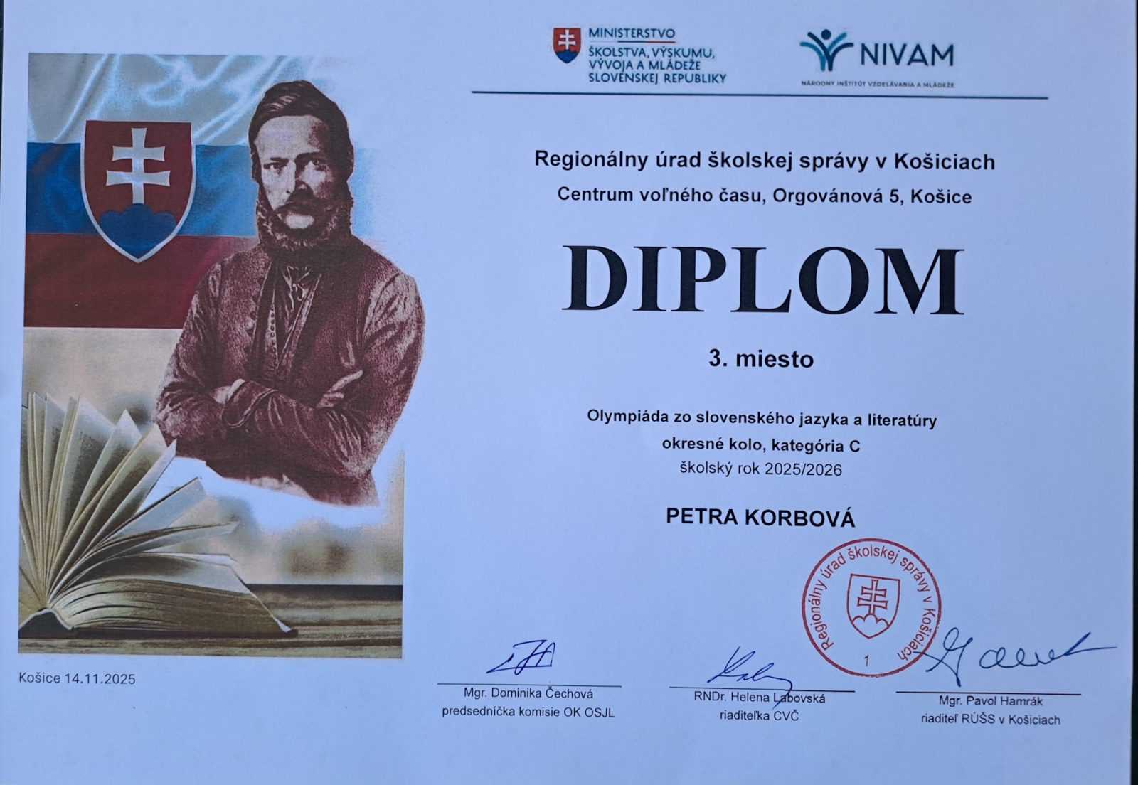 14. 11. 2025 sa naša žiačka Petra Korbová zúčastnila okresného kola Olympiády zo slovenského jazyka a literatúry v CVČ Domino. Svojím vystupovaním, spracovaním témy i povinným testom zaujala natoľko, že si vyslúžila v tejto prestížnej súťaži 3. miesto.